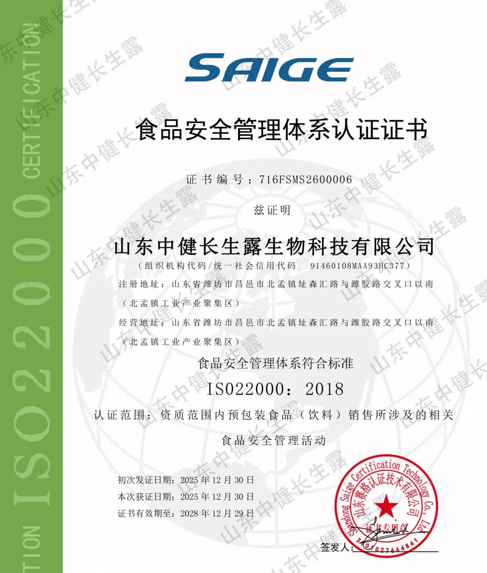 此次认证中,审核专家组通过文件评审、现场核查、流程逃溯等度、全方位严苛查验,对山东中健长生露的质量办理系统、出产操做规范、风险防控机制等进行深度核验,最终确认企业完全契合ISO国际尺度及GB/T 22000国度尺度要求,正式授予认证证书,这既是对企业规范化运营的高度承认,更是对中国生物健康财产尺度化扶植的无力必定。